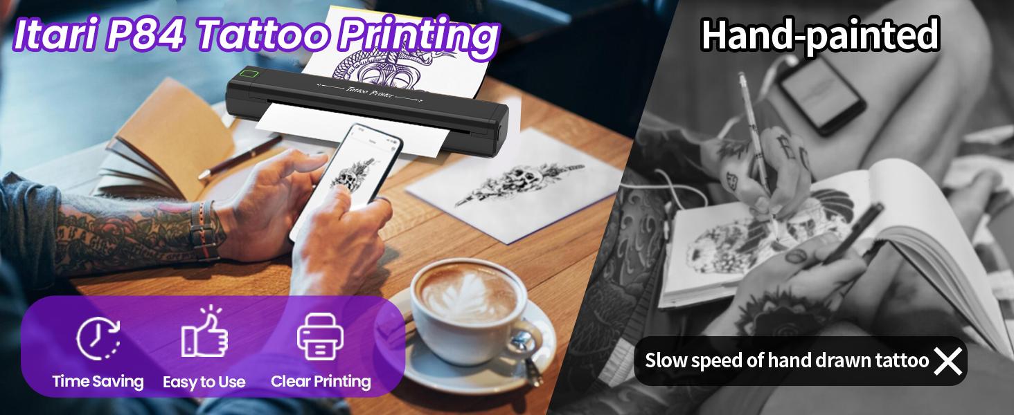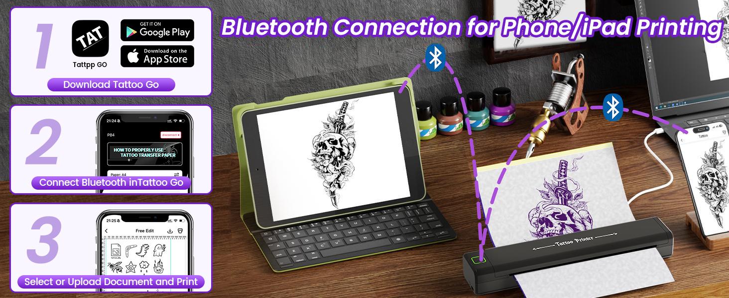 Compatible con teléfono, tableta y PC : conectividad inalámbrica Bluetooth, que le permite imprimir diseños de tatuajes directamente desde su dispositivo móvil o computadora.